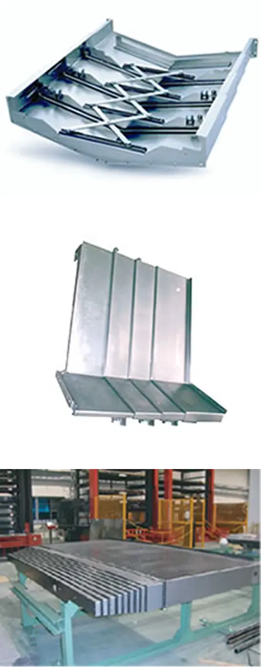 金属切粉やクーラントから駆動系を守る金属カバーです。大きさは3500幅まで、速度は120m・2Gまで対応可能です。 速度・加速度・形状に対応して、以下の種類があります。 1. リンク機構なし 大型や低速 2. リンク機構あり ・SM 一連リンク機構 ・DSM 二連リンク機構 ・SPM-D シンクロナイズ リンク機構 (Keyarrow社技術提携仕様)